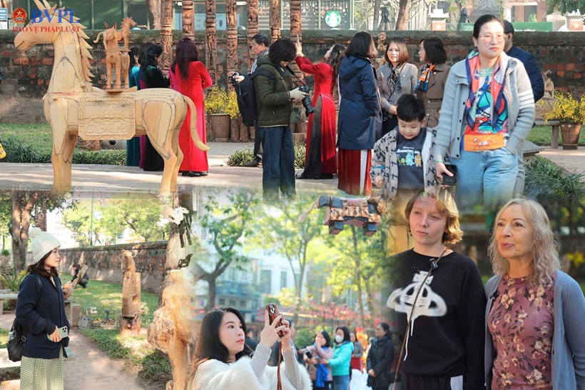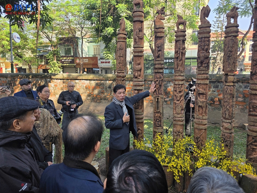 | Không gian trưng bày các cột tượng gỗ nghệ thuật dân gian tại Văn Miếu – Quốc Tử Giám thu hút sự chú ý của người dân và du khách. |