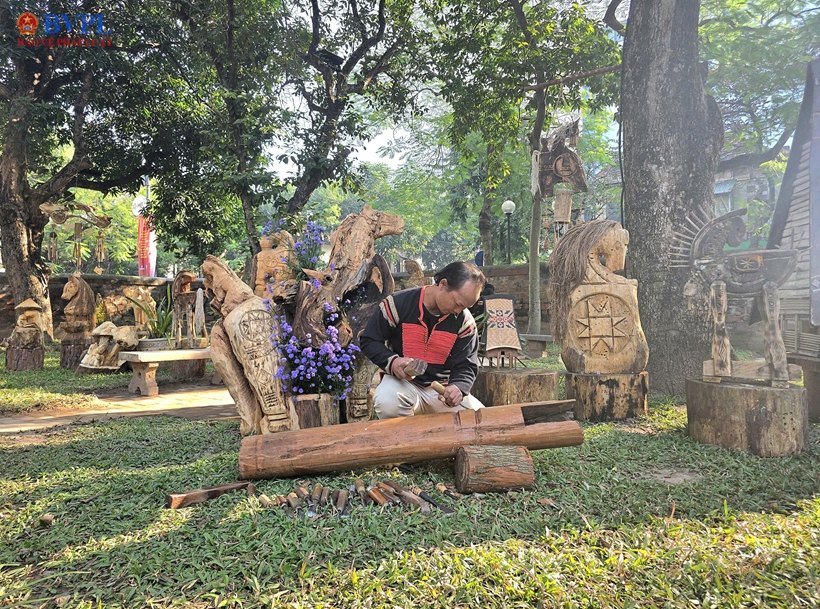 | Nghệ nhân người Tây Nguyên tỉ mỉ điêu khắc gỗ, góp phần gìn giữ giá trị văn hóa truyền thống. |