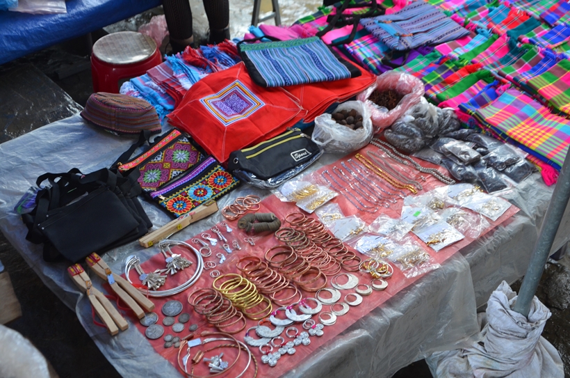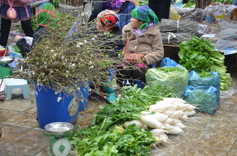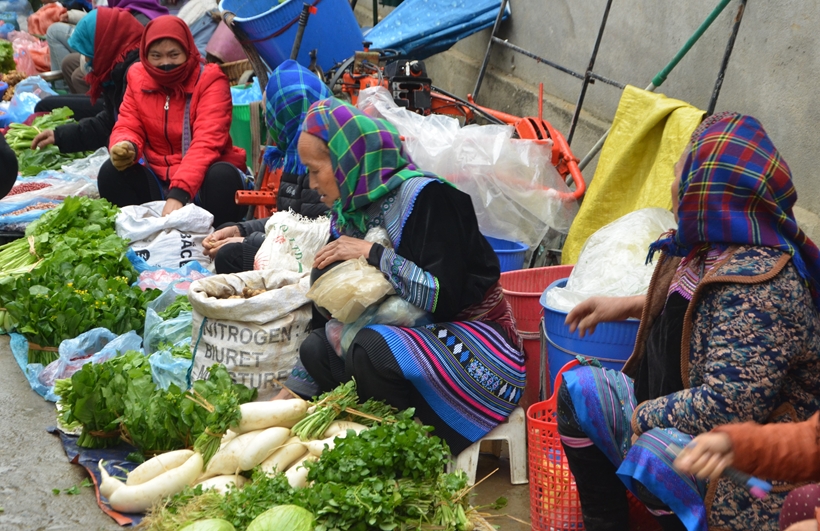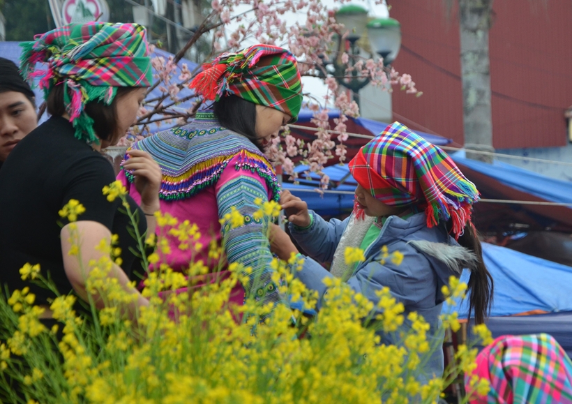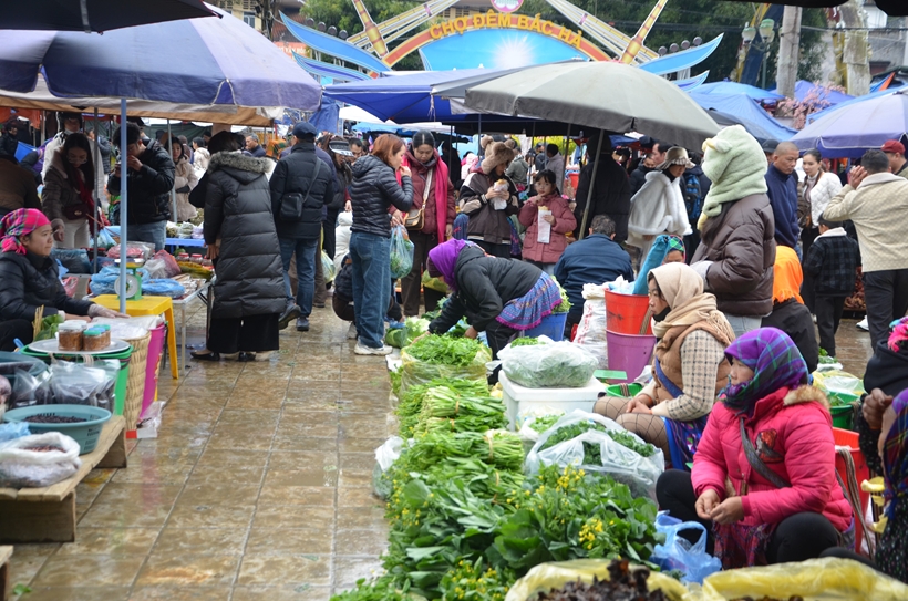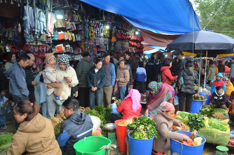 Từ sáng sớm, từng tốp người từ các bản làng xuống chợ. Trên vai là gùi nông sản, trên tay là những bó rau non, những tấm vải thổ cẩm mới dệt. Không gian như được đánh thức bởi sắc màu trang phục truyền thống của phụ nữ Mông, Dao, Tày, Nùng. Váy áo rực rỡ nổi bật giữa nền trời xanh, tạo nên bức tranh mùa xuân sinh động. Du khách đứng giữa dòng người ấy có thể cảm nhận rõ nhịp sống đang chảy, không phải của một điểm tham quan, mà của một cộng đồng đang sinh hoạt thật.