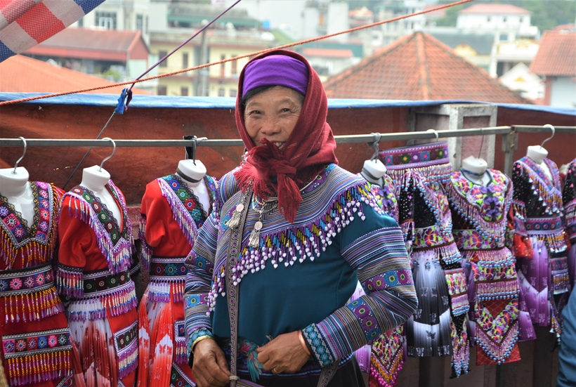 | Du khách trải nghiệm mặc đồ truyền thống của đồng bào dân tộc tại khuôn viên của chợ phiên Bắc Hà. |