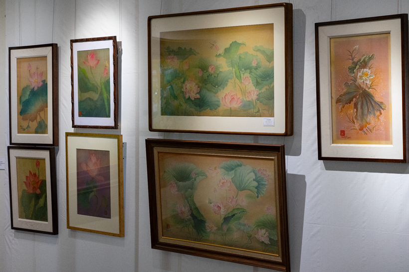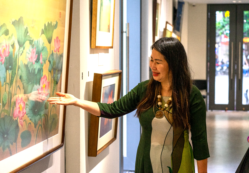 Nếu phần trưng bày chung mang tính đa thanh, thì phần thứ hai - triển lãm cá nhân “Vũ điệu hoa sen” của họa sĩ Hường Lê lại mở ra một không gian nghệ thuật mang đậm dấu ấn riêng. Với 20 tác phẩm tranh lụa, trong đó có nhiều bức khổ lớn, Hường Lê lựa chọn cách kể chuyện nhẹ nhàng, tiết chế nhưng giàu cảm xúc.