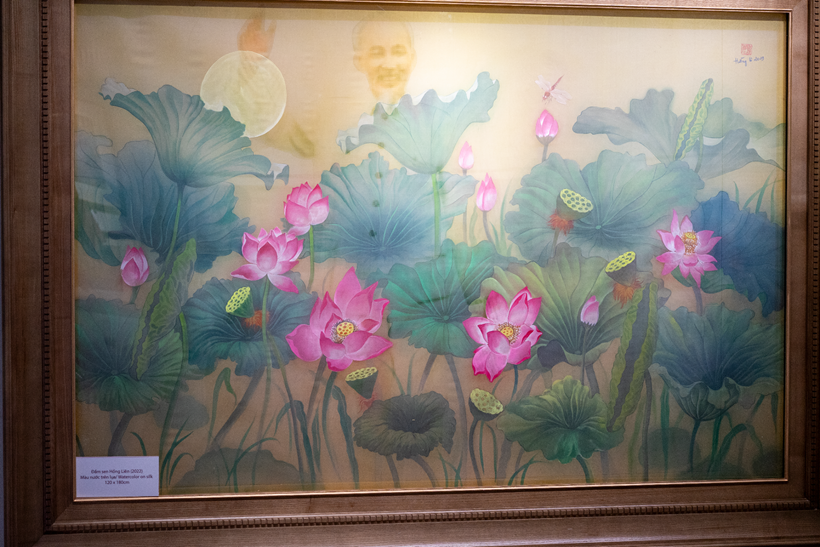 Chính sự đồng điệu ấy khiến Hường Lê lựa chọn hoa sen như một “ngôn ngữ” xuyên suốt trong sáng tác, đặc biệt khi muốn thể hiện tình cảm với Chủ tịch Hồ Chí Minh. Với chị, vẽ sen không chỉ là vẽ cái đẹp, mà còn là cách kể lại những giá trị giản dị, thanh cao bằng hội họa. Và trên nền lụa mỏng, từng lớp màu, từng đường nét như trở thành nơi chị gửi gắm sự tĩnh lặng, chiêm nghiệm và lòng trân trọng đối với những điều bền vững trong văn hóa Việt.