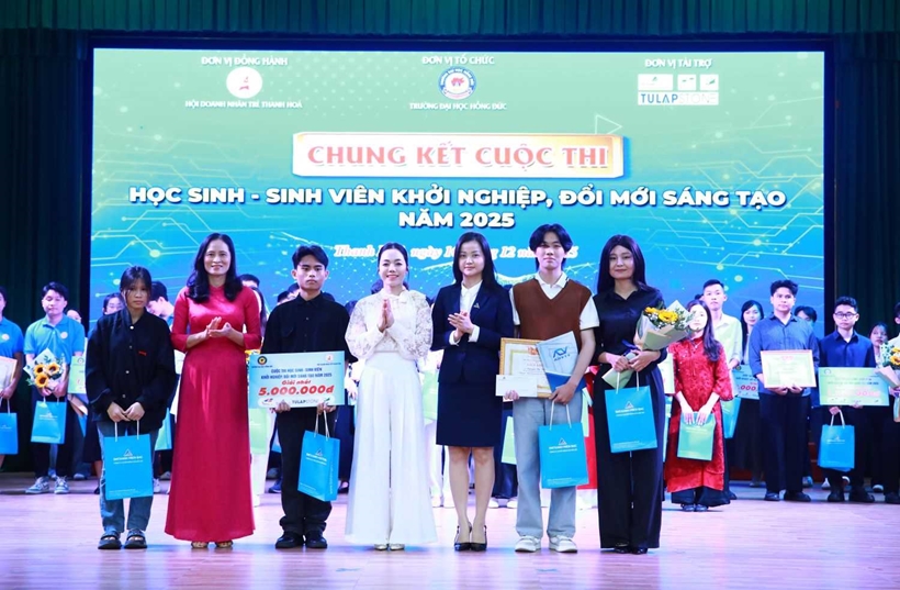 | Ban Tổ chức trao giải nhất cho dự án “MEDIBOT - Robot vệ sinh tự động và vận chuyển mẫu xét nghiệm trong bệnh viện” (tại Chung kết Cuộc thi “Học sinh - Sinh viên khởi nghiệp” năm 2025 do Trường Đại học Hồng Đức phối hợp với Hội Doanh nhân trẻ Thanh Hóa tổ chức). |