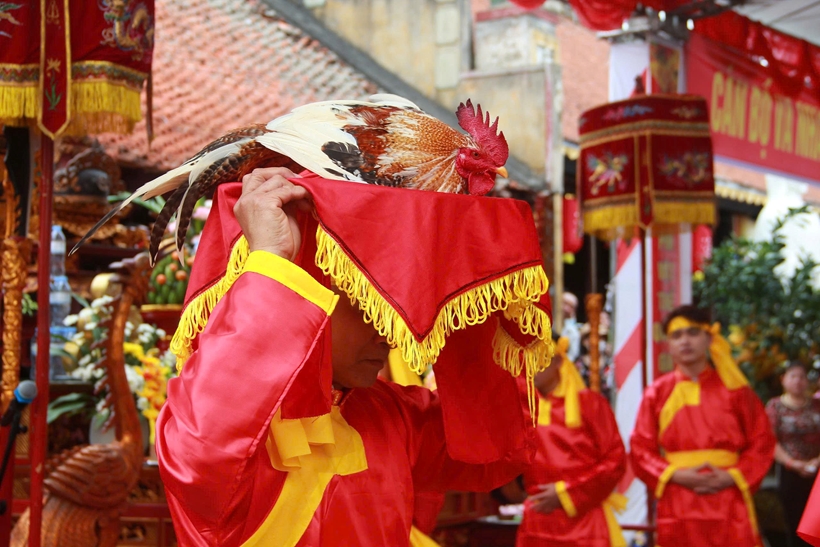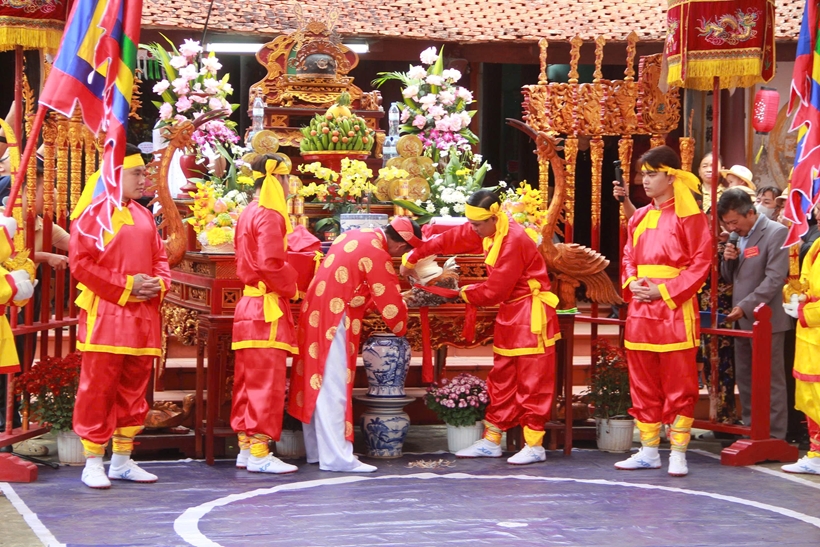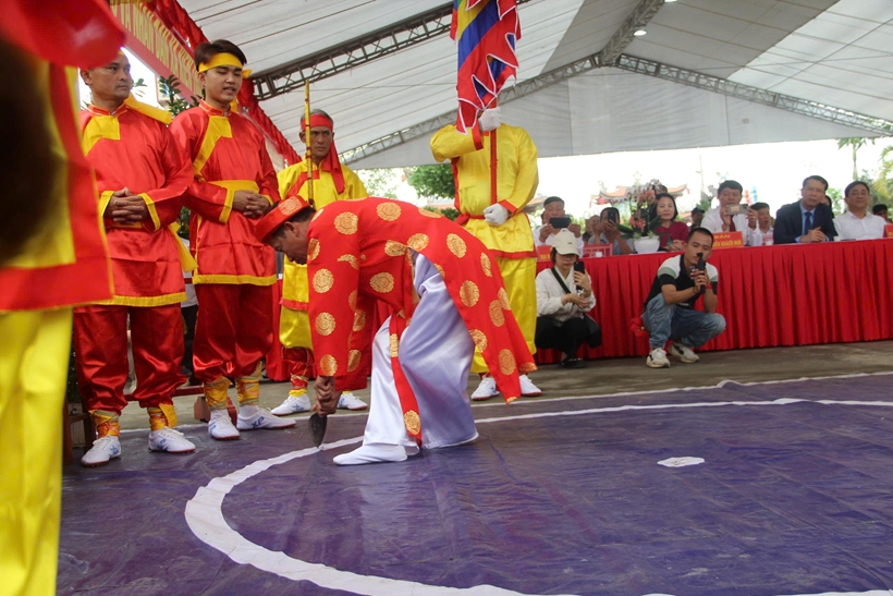 Trong nghi lễ chính, phần minh thề được tiến hành trang nghiêm, được xem là “phần hồn” của lễ hội. Sau khi đọc chúc văn, các vị kỳ lão, chức sắc được rước ra đài thề. Chủ tế thực hiện nghi thức cắm dao bầu xuống điểm thiêng, vẽ “vòng thiêng, đại diện tư văn đọc Hịch văn thề trước cộng đồng. Tiếp đó, chủ tế cắt tiết gà trống chân vàng, lông vàng, hòa huyết vào bình rượu. Bình rượu được truyền tay các bô lão, chức sắc và Nhân dân cùng uống một ngụm, thể hiện quyết tâm thực hiện lời thề liêm chính.