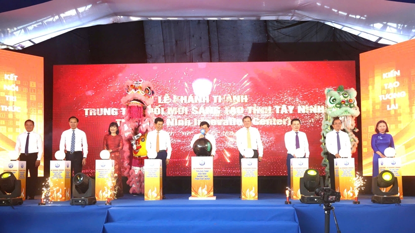 Các đại biểu thực hiện nghi thức khánh thành Trung tâm Đổi mới sáng tạo tỉnh Tây Ninh. Ảnh: LS