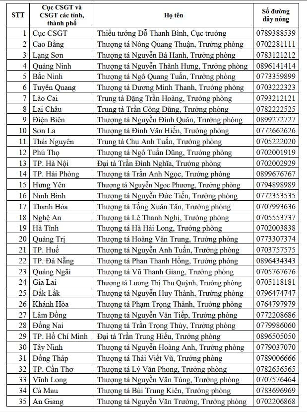 | Cục CSGT công khai số điện thoại đường dây nóng của Cục và Trưởng phòng CSGT 34 địa phương. |