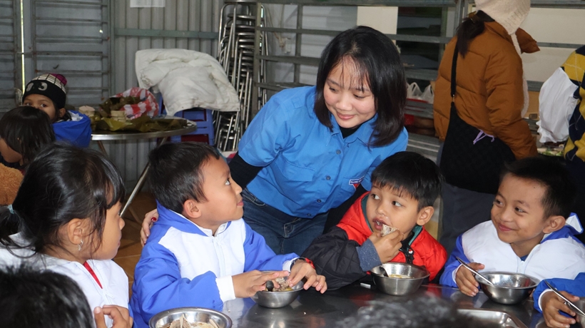 | Các đoàn viên đã tổ chức nấu ăn cho các em học sinh. |