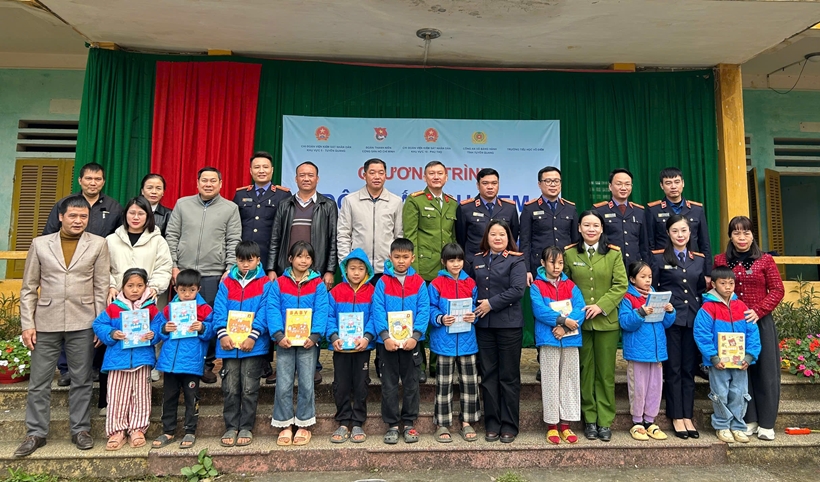 | Chi đoàn VKSND khu vực 10, tỉnh Phú Thọ phối hợp với Chi đoàn VKSND khu vực 5, tỉnh Tuyên Quang trao quà cho các em học sinh. |