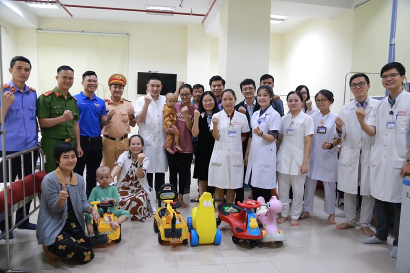 Niềm vui của một bệnh nhân nhí bên các cô chú. |