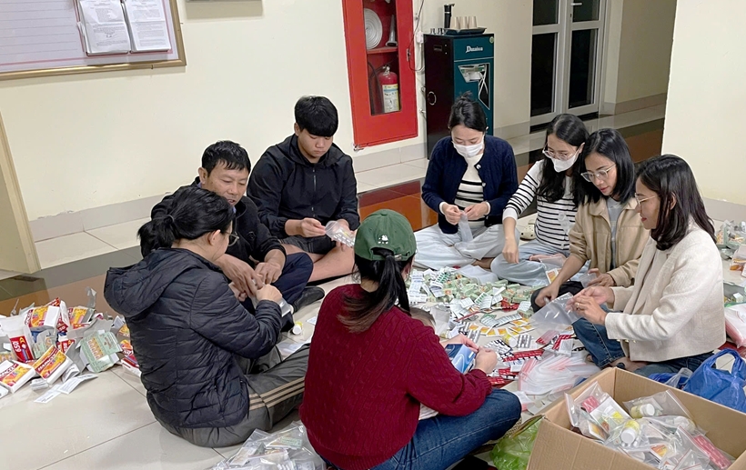 | Từng túi thuốc (gồm thuốc đau bụng, hạ sốt, dầu gió..) được đóng gói kỹ càng. |
