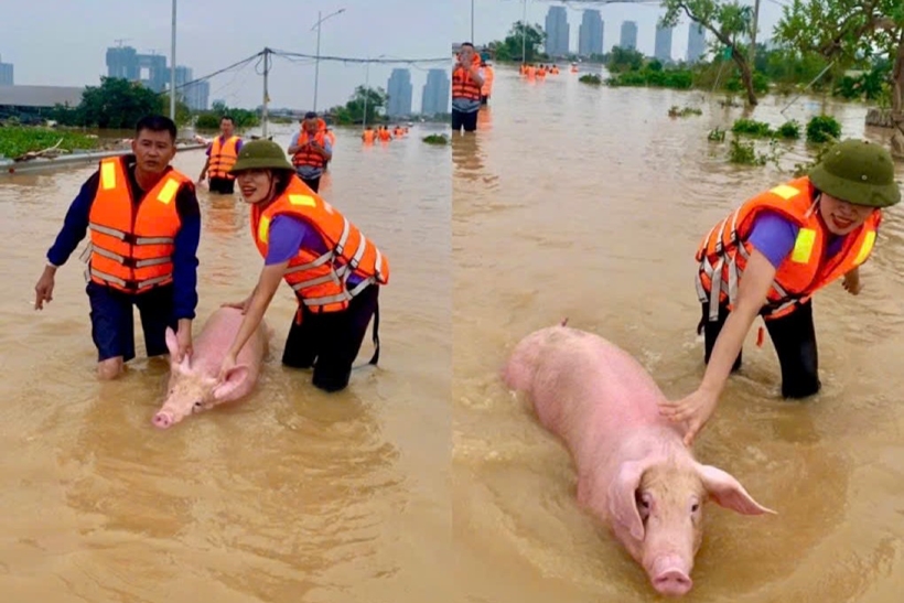 | Nữ kiểm sát viên xung phong tham gia đoàn giải cứu lợn tại khu vực ngập lụt bãi Phụng Công. |