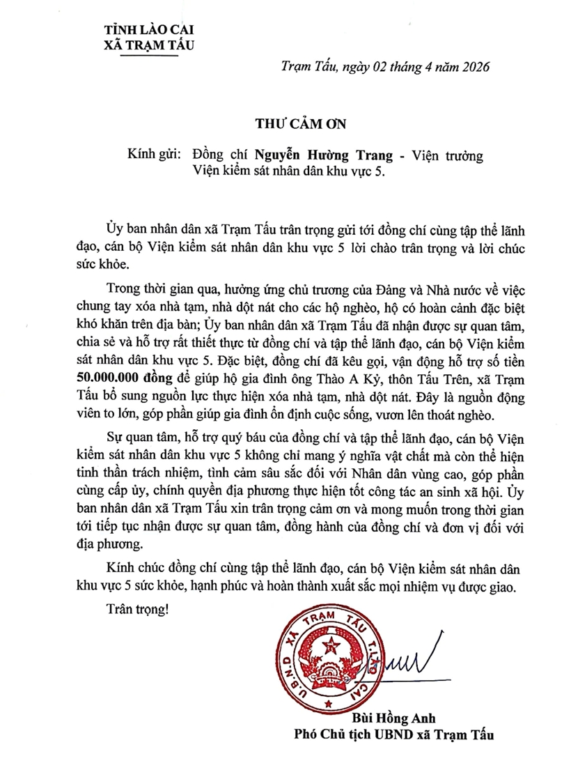 Ghi nhận sự quan tâm, hỗ trợ kịp thời của đơn vị, UBND xã Trạm Tấu đã có thư cảm ơn gửi VKSND khu vực 5. Trong thư nêu rõ, sự giúp đỡ của đơn vị không chỉ có ý nghĩa về vật chất mà còn là nguồn động viên to lớn về tinh thần đối với gia đình được hỗ trợ nói riêng và Nhân dân địa phương nói chung; đồng thời thể hiện tinh thần trách nhiệm, sự sẻ chia đối với cộng đồng, góp phần cùng địa phương thực hiện hiệu quả công tác an sinh xã hội, xóa nhà tạm, nhà dột nát.