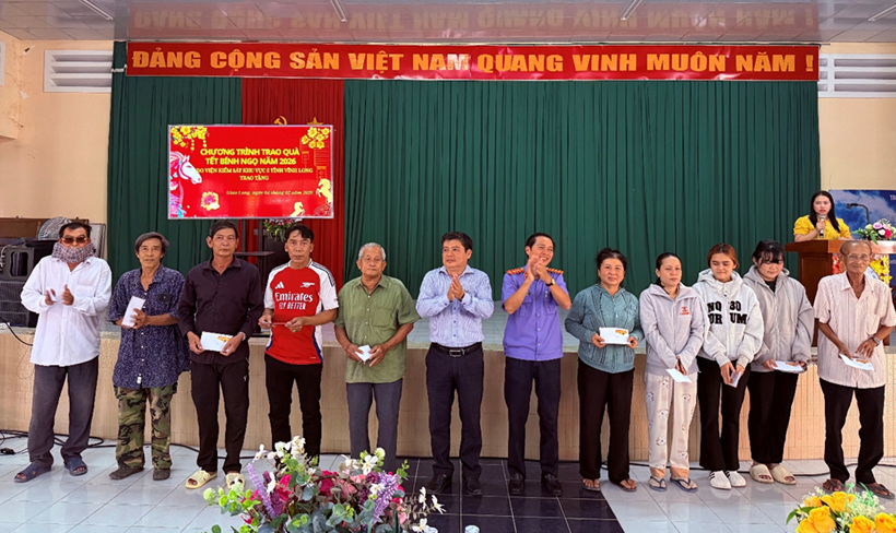 Theo đó, thực hiện công tác an sinh xã hội nhân dịp Tết Nguyên đán Bính Ngọ Năm 2026, VKSND Khu vực 5, tỉnh Vĩnh Long phối hợp với Đảng ủy, Ủy ban nhân dân và Ủy ban Mặt trận Tổ quốc Việt Nam xã Giao Long tổ chức trao quà Tết cho 100 hộ dân thuộc diện chính sách, gia đình có hoàn cảnh khó khăn trên địa bàn.