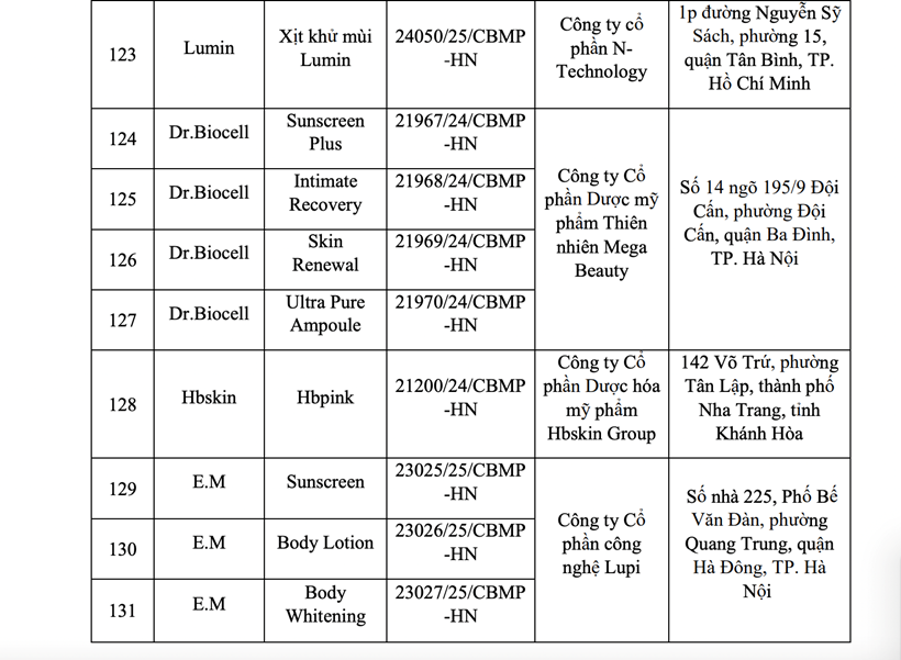 Cục Quản lý dược đề nghị Sở Y tế các tỉnh, thành phố thông báo cho các cơ sở kinh doanh, sử dụng mỹ phẩm trên địa bàn ngừng ngay việc kinh doanh, sử dụng 131 sản phẩm nêu trên và trả lại cơ sở cung ứng sản phẩm;