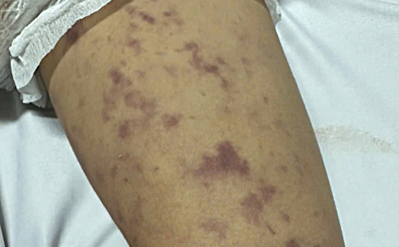 | Những nốt tử ban trên da khắp cơ thể bệnh nhi mắc viêm não mô cầu (ảnh: Quang Nhật). |