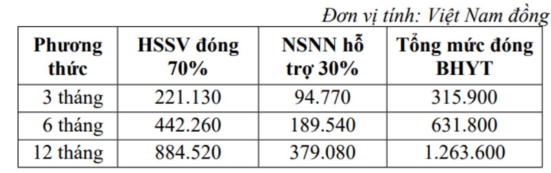 Từ ngày 1/7/2024, mức đóng BHYT hằng tháng của học sinh - sinh viên bằng 4,5% mức lương cơ sở (trong đó ngân sách nhà nước hỗ trợ 30%, còn lại học sinh - sinh viên tự đóng 70%). Phụ huynh, học sinh - sinh viên có thể linh động lựa chọn đóng theo 3 phương thức gồm 3 tháng, 6 tháng hoặc 12 tháng một lần. Mức đóng cụ thể như sau: