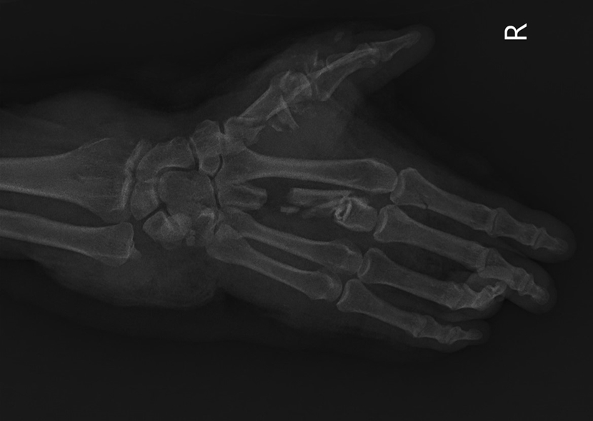 | Hình ảnh chụp X-quang cổ tay và bàn tay người bênh trước phẫu thuật. |