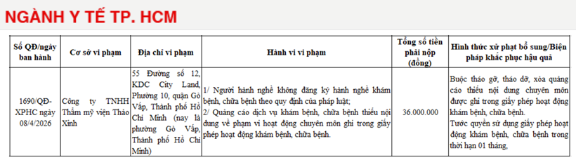 Với các vi phạm nêu trên, Thẩm mỹ viện Thảo Xinh bị xử phạt số tiền 36 triệu đồng. Đồng thời, Thẩm mỹ viện Thảo Xinh còn bị áp dụng các hình thức xử phạt bổ sung và biện pháp khắc phục hậu quả. Cụ thể, cơ sở buộc tháo gỡ, xóa bỏ toàn bộ nội dung quảng cáo chưa đúng quy định trong lĩnh vực khám bệnh, chữa bệnh.