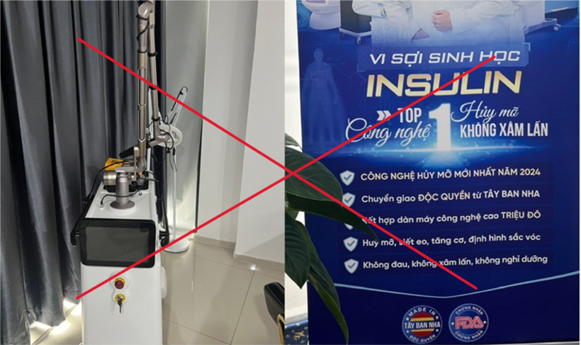 Bên cạnh đó, Sở Y tế còn ghi nhận các nội dung quảng cáo tại trang mạng xã hội Facebook và các poster, standee có nội dung “Vi sợi sinh học Insulin - Top 1 công nghệ hủy mỡ không xâm lấn - Chuyển giao độc quyền từ Tây ban Nha…”.