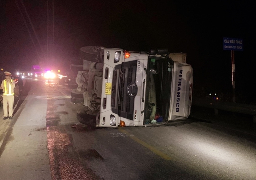 | Chiếc xe tải lật nghiêng tại hiện trường. |