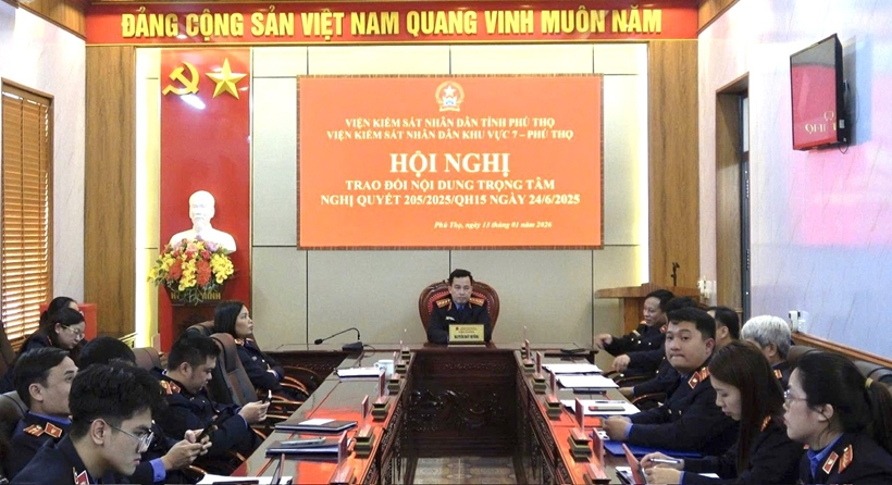 | Đồng chí Nguyễn Đức Hưởng, Viện trưởng VKSND khu vực 7 chủ trì cuộc họp triển khai tuyên truyền Nghị quyết 205 của Quốc hội. |