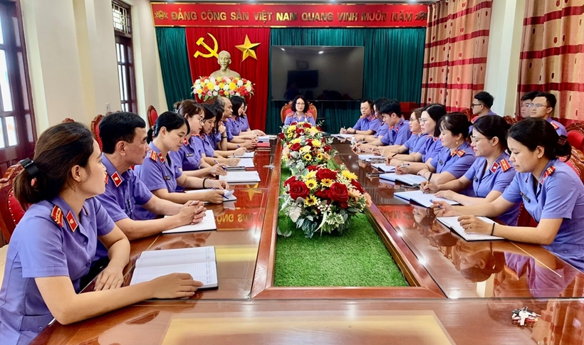 | Đồng chí Nguyễn Thị Phương Thảo, Viện trưởng VKSND khu vực 4, tỉnh Hưng Yên chủ trì cuộc họp đơn vị. |