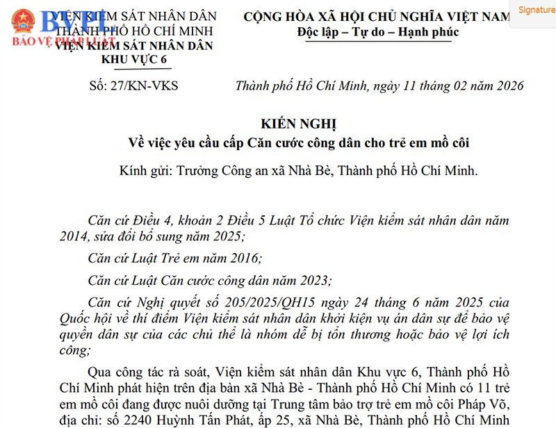 Ngày 11/2/2026, VKSND Khu vực 6 đã ban hành Kiến nghị số 27/KN-VKS gửi Trưởng Công an xã Nhà Bè về việc xem xét, hướng dẫn và thực hiện thủ tục cấp Căn cước công dân cho 11 trẻ em mồ côi đang được nuôi dưỡng tại Trung tâm bảo trợ trẻ em mồ côi Pháp Võ.