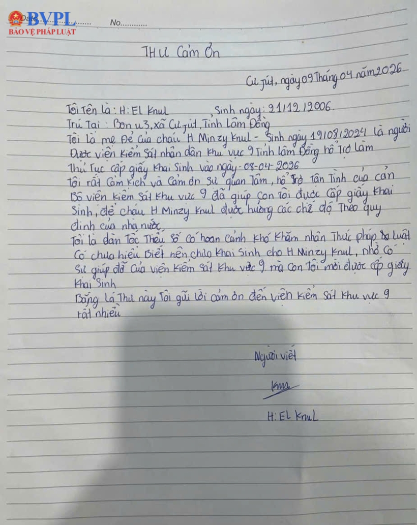 Ngày 9/4, chị H El Knul (SN 2006, trú tại xã Cư Jút, tỉnh Lâm Đồng) đã có thư cảm ơn gửi đến VKSND khu vực 9 (tỉnh Lâm Đồng) sau khi con gái chị là cháu H Minzy Knul (SN 2024) được hỗ trợ làm thủ tục cấp giấy khai sinh vào ngày 8/4.