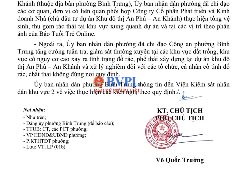 Đến ngày hôm nay, 22/4/2026, UBND phường Bình Trưng đã có văn bản phản hồi, thông tin kết quả tiếp thu và thực hiện các nội dung kiến nghị của VKSND Khu vực 2. Theo đó, địa phương đã chỉ đạo các cơ quan, đơn vị liên quan phối hợp với Công ty Cổ phần Phát triển và Kinh doanh Nhà là chủ đầu tư dự án Khu đô thị An Phú - An Khánh - tổ chức tổng vệ sinh, thu gom rác thải tại khu vực xung quanh dự án và các vị trí được phản ánh.