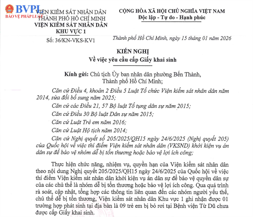Ngày 15/1/2026, VKSND Khu vực 1 TP Hồ Chí Minh đã ban hành Kiến nghị số 36/KN-VKS-KV1 gửi Chủ tịch Ủy ban nhân dân phường Bến Thành, TP Hồ Chí Minh về việc yêu cầu cấp Giấy khai sinh cho trẻ em bị bỏ rơi.