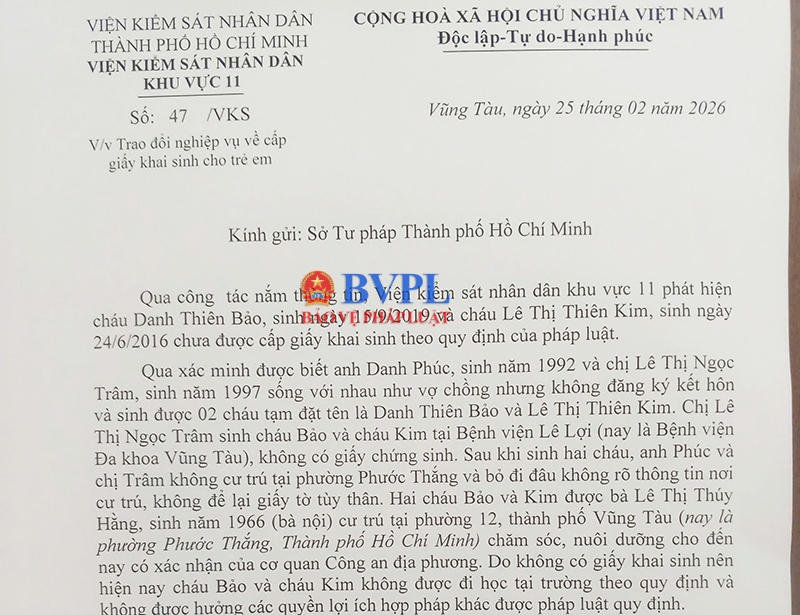Trước thực tế trên, ngày 25/2/2026, VKSND Khu vực 11 đã có văn bản kiến nghị gửi Sở Tư pháp TP Hồ Chí Minh, đề nghị hướng dẫn và chỉ đạo UBND phường Phước Thắng xem xét, giải quyết việc đăng ký khai sinh cho hai cháu theo đúng quy định pháp luật.