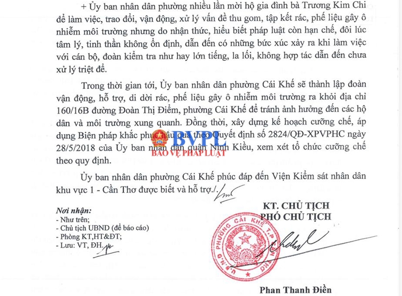 Trên cơ sở kiến nghị của VKSND Khu vực 1, UBND phường Cái Khế cho biết sẽ tiếp tục tăng cường vận động, hỗ trợ di dời phế liệu ra khỏi khu dân cư, đồng thời xây dựng kế hoạch xử lý dứt điểm tình trạng ô nhiễm tại khu vực nói trên.