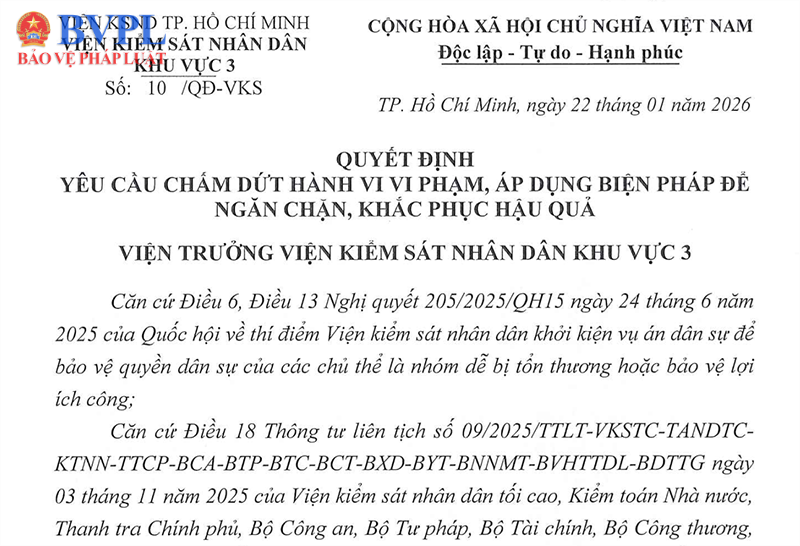 | Quyết định chấm dứt hành vi vi phạm của VKSND Khu vực 3 TP Hồ Chí Minh. |