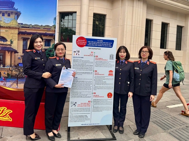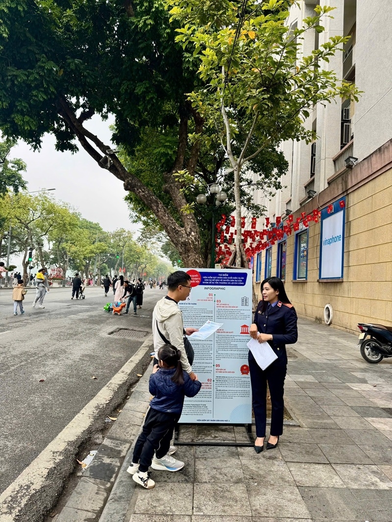 Bên cạnh đó, tận dụng lợi thế về vị trí địa lý, VKSND khu vực 1, TP Hà Nội đã tiến hành đặt các pano tuyên truyền tại khu vực Phố đi bộ Bờ Hồ vào các ngày cuối tuần, in tờ rơi tuyên truyền về tố tụng công ích để người dân hiểu về cơ chế bảo vệ lợi ích công cộng, cũng như quyền phản ánh, kiến nghị khi phát hiện các hành vi xâm phạm lợi ích chung của xã hội.