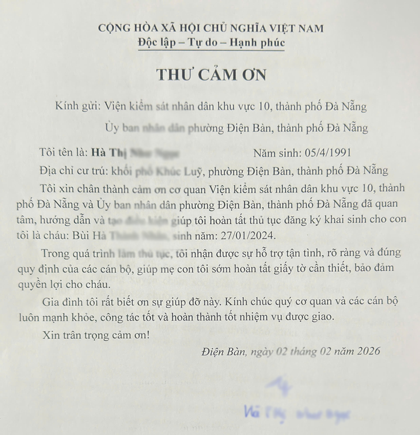 | Chị N.N đã gửi thư cảm ơn VKSND khu vực 10 và UBND phường Điện Bàn, TP Đà Nẵng vì đã tận tình hỗ trợ gia đình chị. |