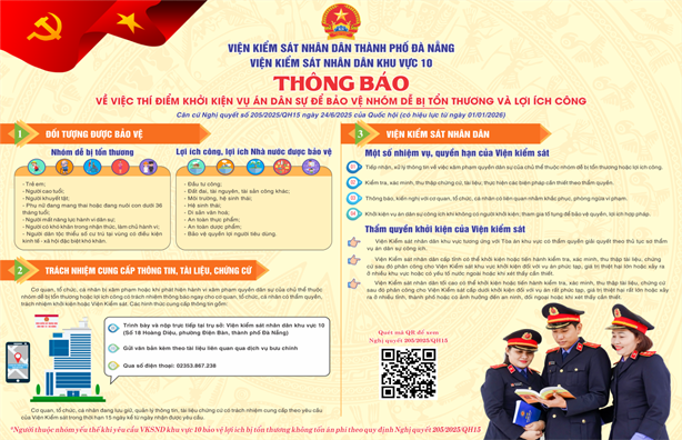 Thực hiện kế hoạch của Đảng ủy VKSND tối cao và Nghị quyết của Đảng ủy VKSND TP Đà Nẵng về việc quán triệt, tổ chức thực hiện Nghị quyết số 205/2025/QH15 ngày 24/6/2025 của Quốc hội khóa XV về thí điểm VKSND khởi kiện vụ án dân sự để bảo vệ quyền dân sự của các chủ thể là nhóm dễ bị tổn thương hoặc bảo vệ lợi ích công, VKSND khu vực 10, TP Đà Nẵng đã triển khai hoạt động tuyên truyền trực quan về nội dung Nghị quyết đến nhân dân trên địa bàn.