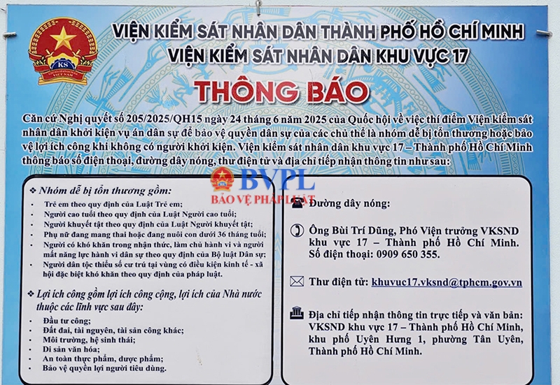 Theo lãnh đạo đơn vị, ngay sau khi Nghị quyết số 205/2025/QH15 của Quốc hội về việc thí điểm Viện kiểm sát nhân dân khởi kiện vụ án dân sự để bảo vệ quyền dân sự của các chủ thể là nhóm dễ bị tổn thương hoặc bảo vệ lợi ích công được quán triệt, VKSND Khu vực 17 đã xây dựng kế hoạch triển khai phù hợp với điều kiện thực tiễn địa phương, xác định công tác tuyên truyền, phổ biến nội dung Nghị quyết đến cơ sở là một trong những nhiệm vụ trọng tâm. Trên cơ sở đó, đơn vị đã phối hợp với chính quyền địa phương tổ chức trao tặng các bảng thông tin tuyên truyền về nội dung cơ bản của Nghị quyết để niêm yết tại trụ sở UBND xã, phường và các khu vực tiếp công dân.