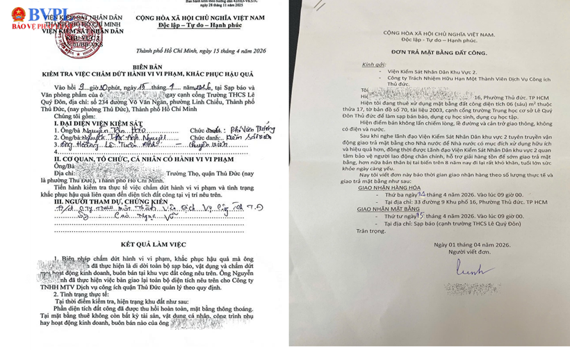 Ngày 15/4/2026, đại diện VKSND Khu vực 2, Công ty TNHH MTV Dịch vụ công ích quận Thủ Đức và ông N.N.V đã tiến hành ký biên bản bàn giao và tiếp nhận mặt bằng đất công tại khu đất, cùng tài sản trên đất là kiot mái tôn, cửa sắt và đồng ý việc tháo dỡ.