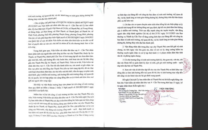 Trên cơ sở đó, VKSND Khu vực 4 đã ban hành kiến nghị gửi Chủ tịch UBND xã Thạnh Phú và Ủy ban Mặt trận Tổ quốc Việt Nam xã Thạnh Phú, yêu cầu khẩn trương phối hợp triển khai các biện pháp xử lý. Nội dung kiến nghị tập trung vào việc tăng cường công tác quản lý, tổ chức thu gom, vận chuyển rác thải đúng quy định; đẩy mạnh tuyên truyền nhằm nâng cao ý thức bảo vệ môi trường của người dân; thường xuyên kiểm tra, kịp thời phát hiện và xử lý các hành vi vi phạm.