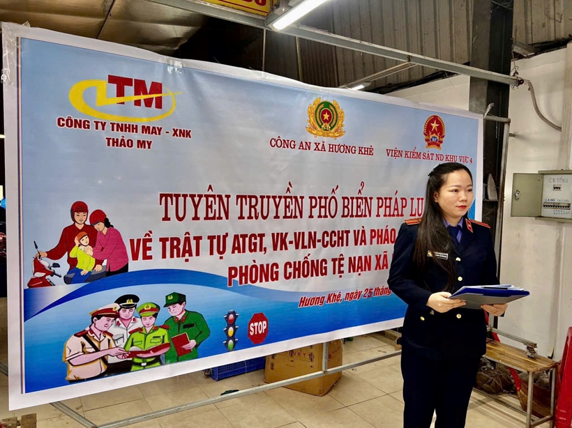 Ngày 27/1/2026, tại trụ sở Công ty TNHH May - XNK Thảo My, VKSND khu vực 4 - Hà Tĩnh phối hợp với Công an xã Hương Khê tổ chức buổi tuyên truyền, phổ biến Nghị quyết số 205/2025/QH15 của Quốc hội và tuyên truyền An toàn giao thông, pháo nổ, PCCC, Phòng chống tệ nạn xã hội cho công nhân.