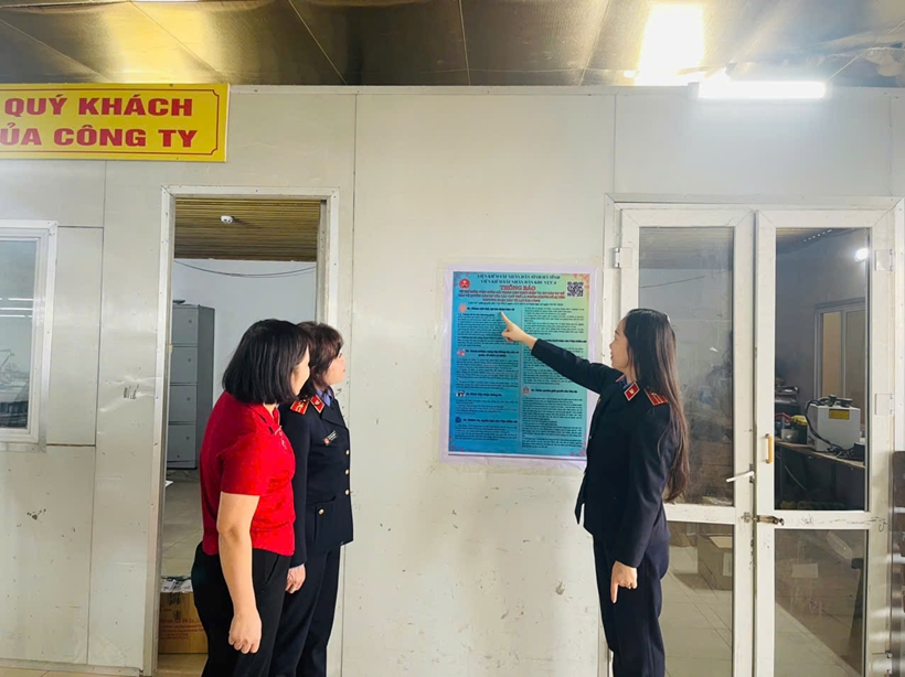 Ngoài nội dung tuyên truyền trực tiếp, VKSND khu vực 4 đã dán pa nô tại trụ sở công ty, để giới thiệu Nghị quyết số 205/2025/QH15 để công nhân dễ dàng tiếp cận và tìm hiểu thêm.