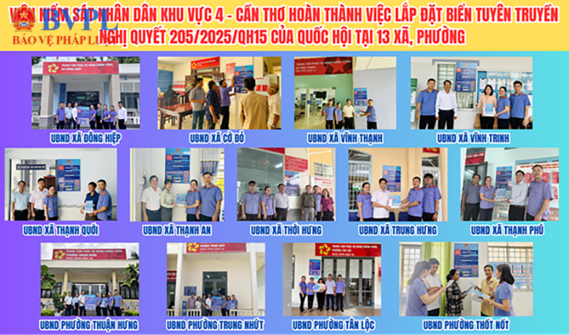 Thực hiện Kế hoạch tuyên truyền pháp luật về việc triển khai Nghị quyết số 205/2025/QH15 của Quốc hội về thí điểm Viện kiểm sát nhân dân khởi kiện vụ án dân sự để bảo vệ quyền dân sự của nhóm dễ bị tổn thương và bảo vệ lợi ích công, VKSND Khu vực 4 TP Cần Thơ đã hoàn thành lắp đặt biển Fomex tuyên truyền tại toàn bộ 13/13 xã, phường trên địa bàn.