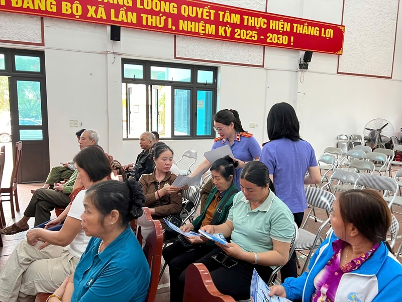 | Kiểm sát viên phát tờ rơi tuyên truyền trong Hội nghị tại UBND xã Tằng Loỏng. |
