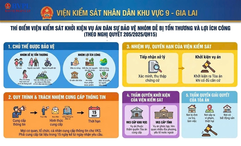 VKSND khu vực 9 (tỉnh Gia Lai) đang đẩy mạnh công tác tuyên truyền về những lợi ích thiết thực của Nghị quyết số 205/2025/QH15 ngày 24/6/2025 của Quốc hội về việc thí điểm VKSND khởi kiện vụ án dân sự bảo vệ nhóm yếu thế và lợi ích công.