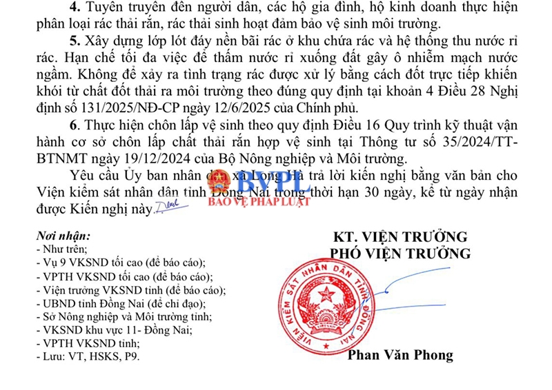 Bên cạnh đó, VKSND tỉnh Đồng Nai cũng yêu cầu áp dụng các biện pháp kỹ thuật nhằm kiểm soát nước rỉ rác, xây dựng hệ thống thu gom và xử lý nước thải, hạn chế tối đa nguy cơ ô nhiễm mạch nước ngầm. Đặc biệt, việc chấm dứt tình trạng đốt rác trực tiếp – một trong những nguyên nhân gây ô nhiễm không khí nghiêm trọng – được đặt ra như một yêu cầu cấp thiết.
