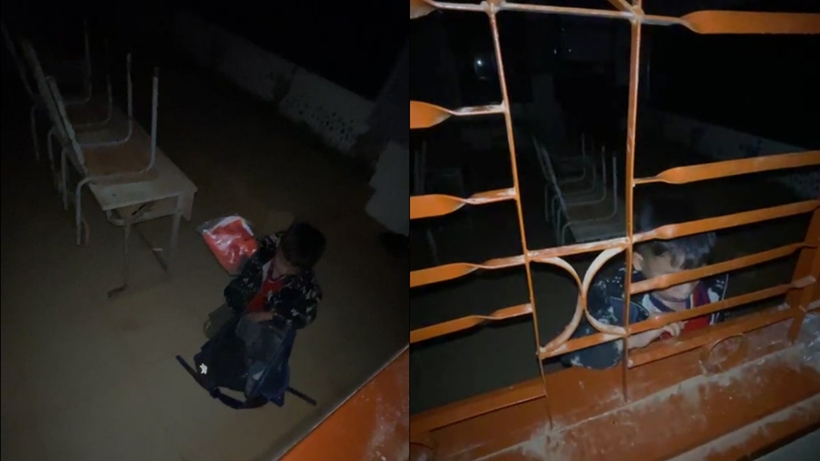 | Học sinh lớp 1 bị kẹt trong lớp. Ảnh cắt từ clip. |