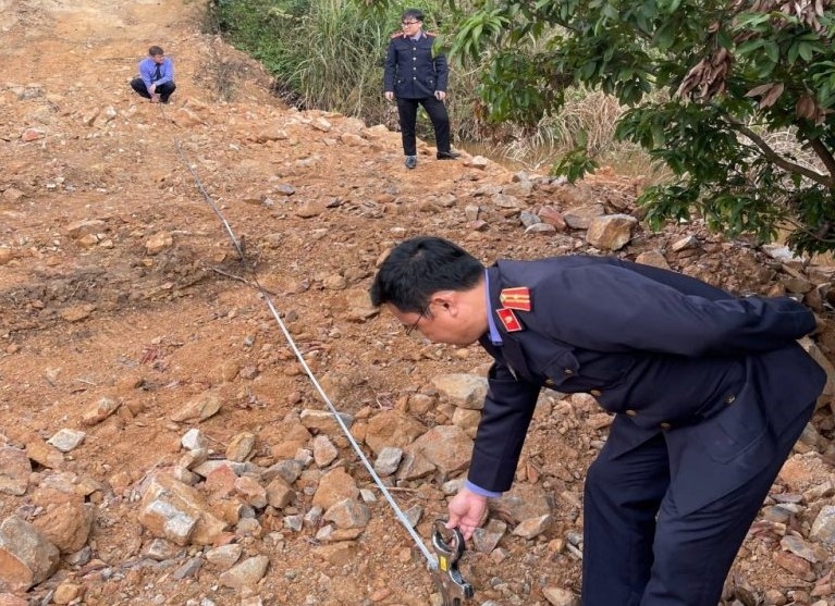 Cụ thể, cơ quan chức năng ghi nhận tình trạng san gạt, lấn chiếm đất, xây dựng kè chắn ngang suối, tự ý điều chỉnh dòng chảy và đổ đất xuống lòng suối khi chưa được cơ quan có thẩm quyền cho phép. Ngay sau khi phát hiện dấu hiệu vi phạm, VKSND khu vực 2 đã chủ động phối hợp với UBND phường Vàng Danh, Công an phường cùng các đơn vị liên quan tiến hành kiểm tra, xác minh thực tế.