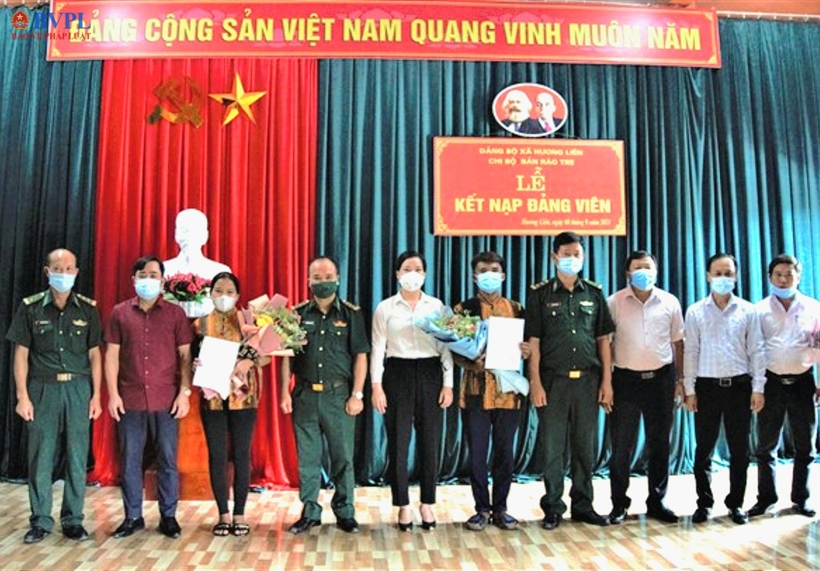 | Đại diện cấp uỷ, chính quyền địa phương, Bộ đội biên phòng chúc mừng 2 quần chúng người Chứt được kết nạp Đảng. Ảnh Minh Toàn. |